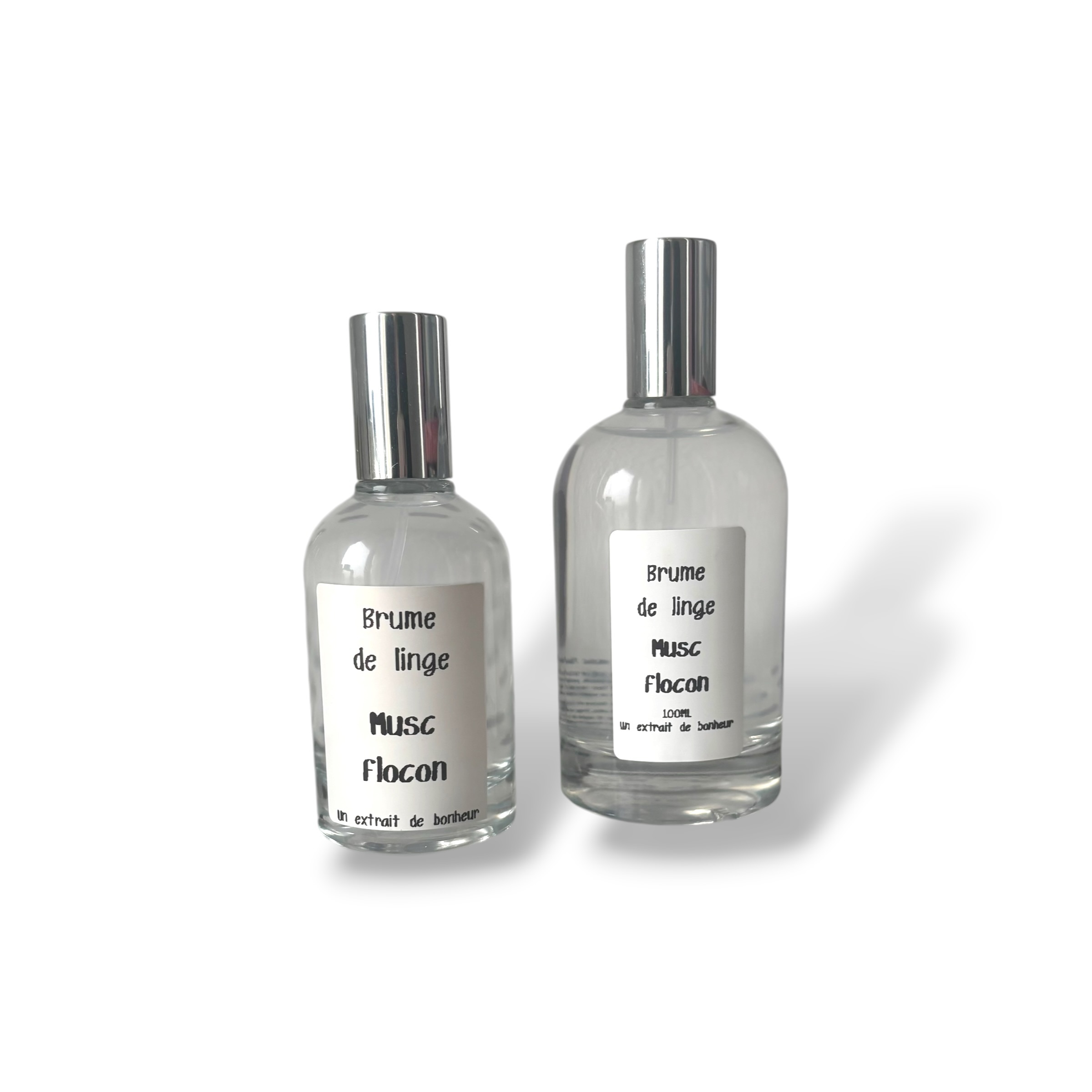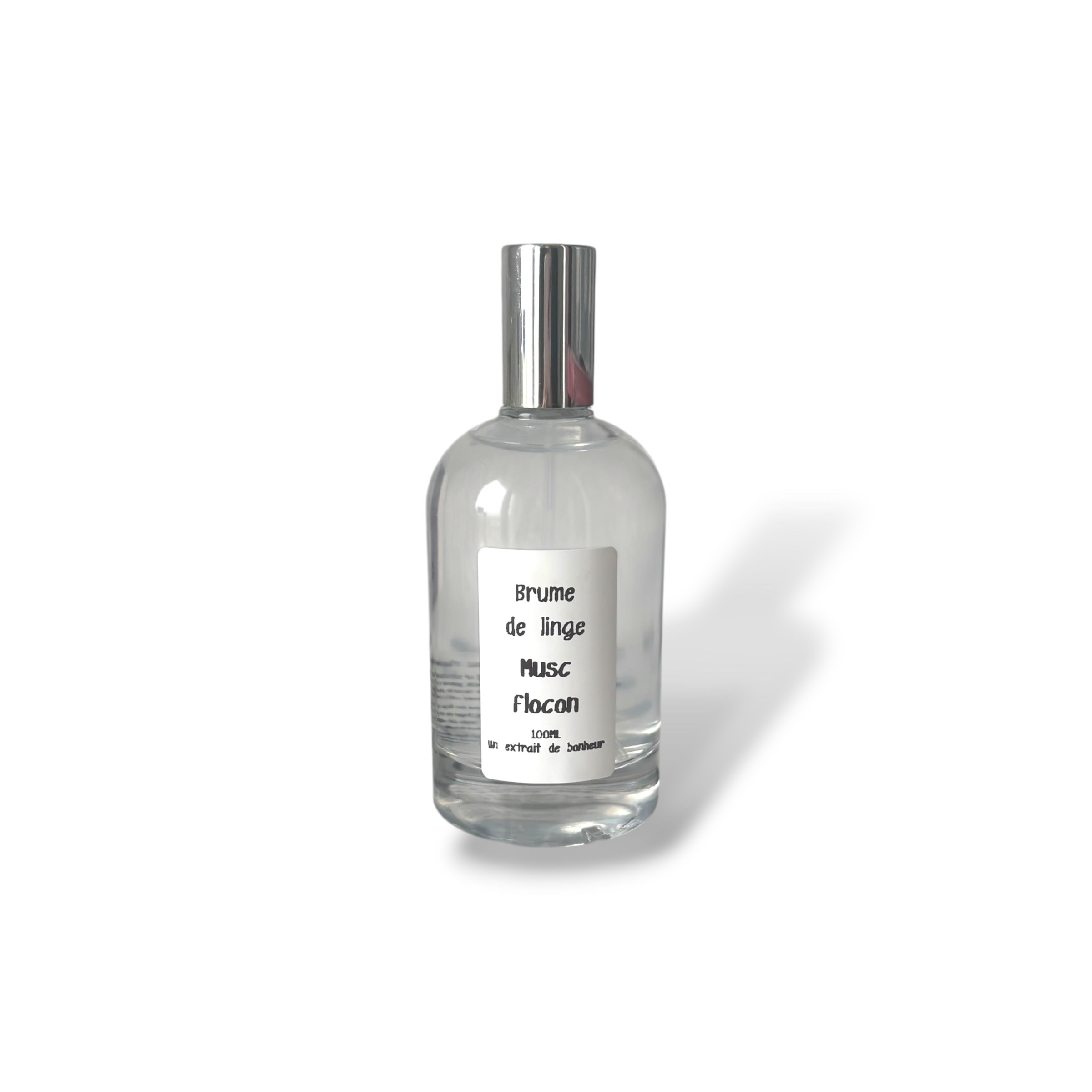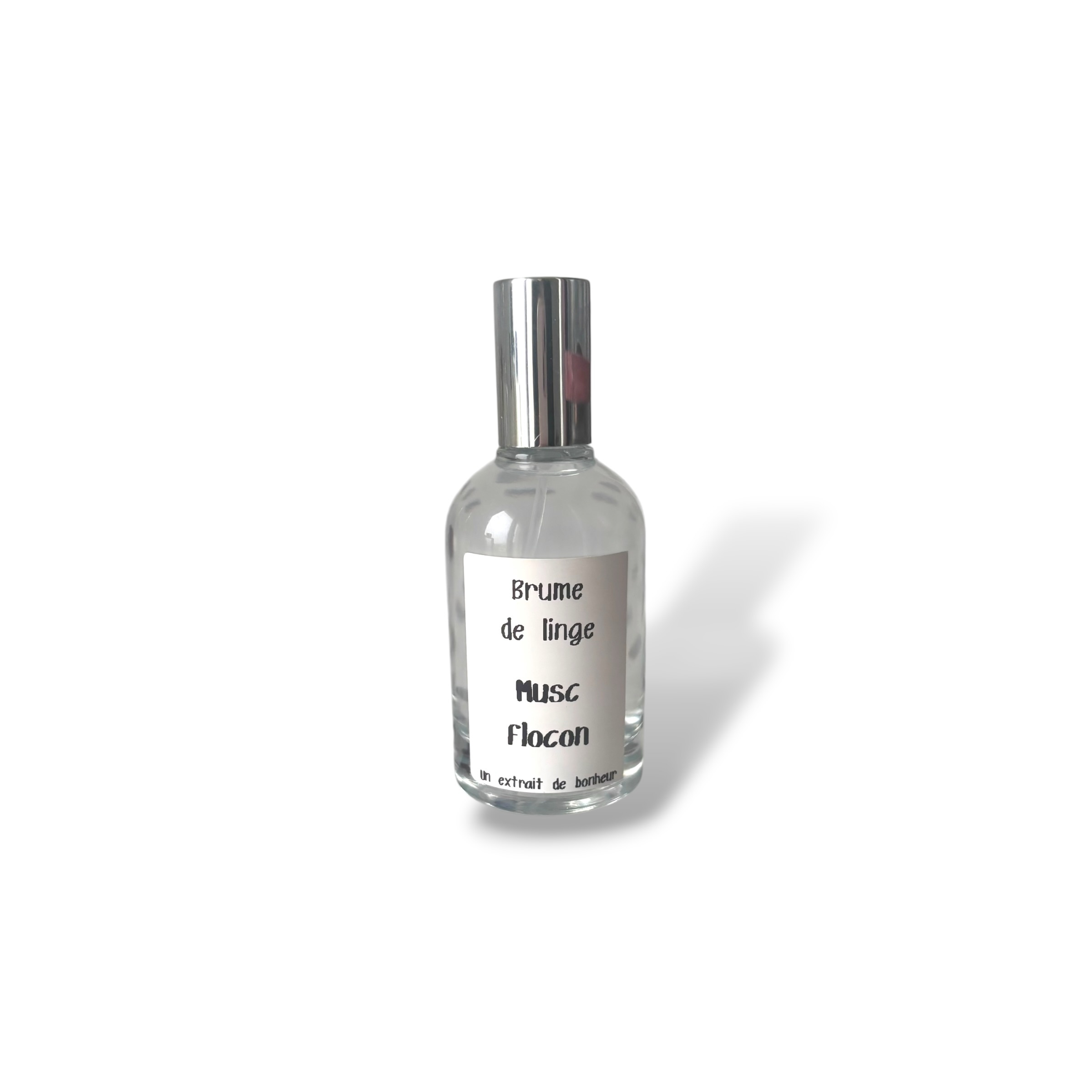 Brume de Linge Musc Flocon, conçue pour envelopper vos tissus d’une fragrance à la fois florale et sensuelle.
